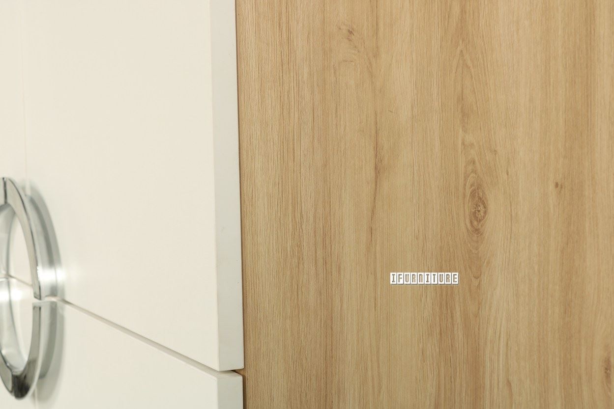 This modern study desk offers a spacious workspace with two closed compartments, three drawers, and an open upper shelf for storage. Golden handles add an elegant touch, while the sleek two-tone finish blends functionality with style, perfect for any home or office.