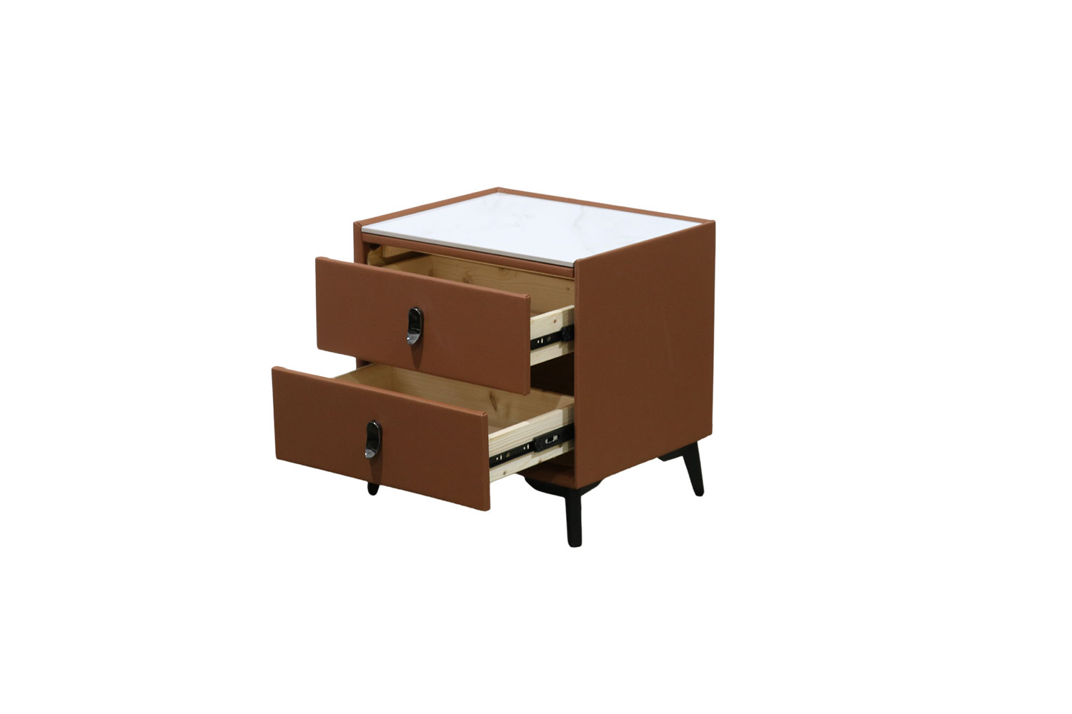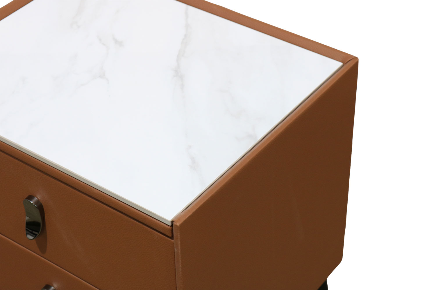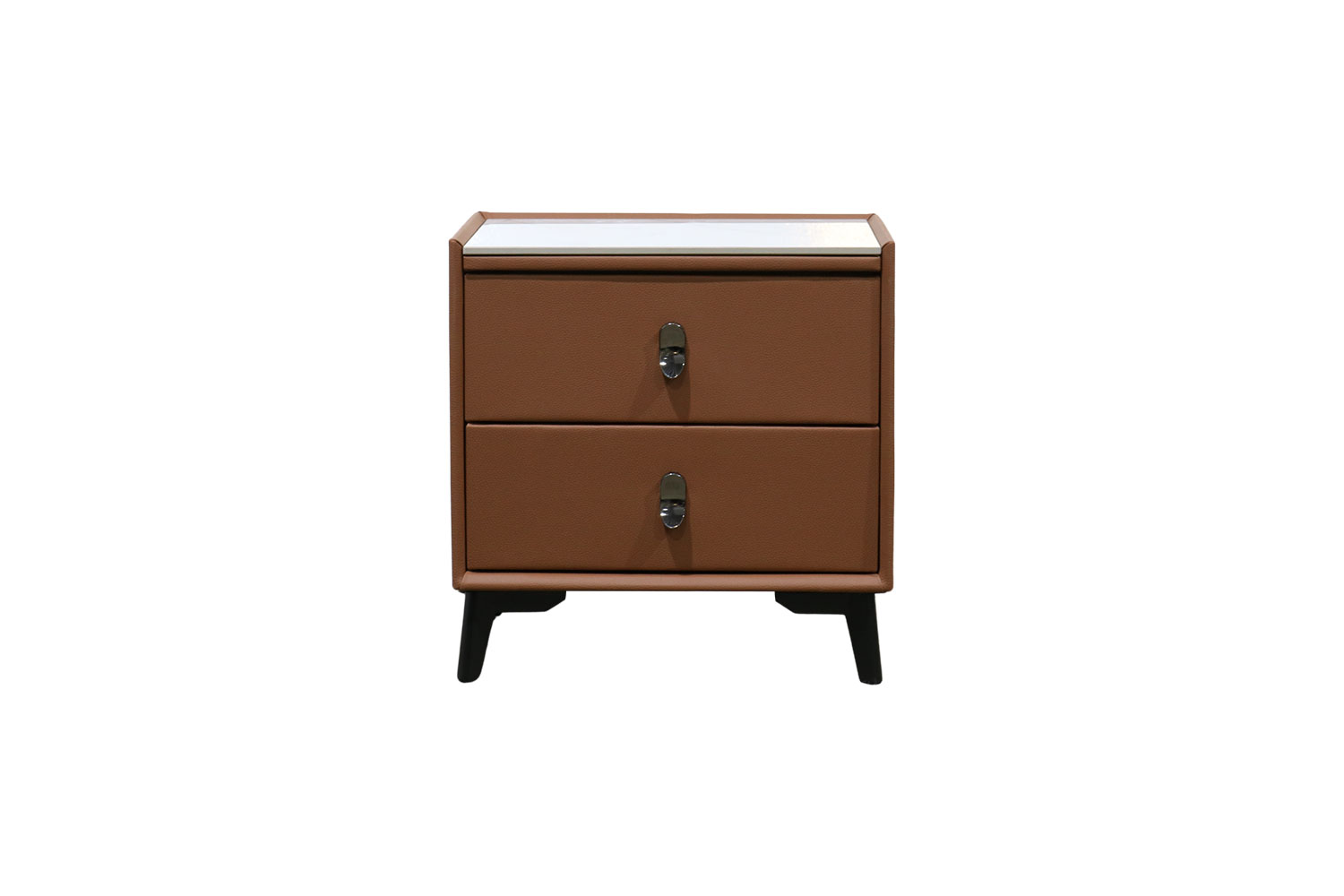 The CUBA 2-Drawer Bedside Table in Brown features a sleek, contemporary design complemented by a sophisticated sintered stone top in a refined slate finish. Crafted from premium materials such as leather, engineered wood, and metal hardware, this table guarantees durability while offering ample storage with its two spacious drawers. Its adaptable placement and effective organization make it an ideal enhancement for any bedroom setup, effortlessly blending style with utility.