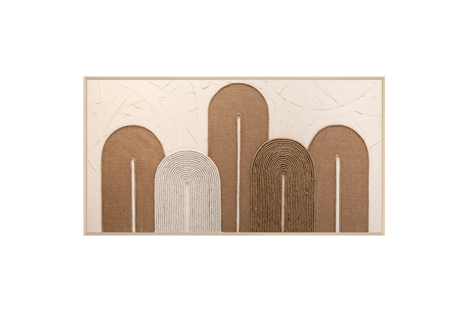 This wall art combines sculptural form and natural texture in a refined, modern composition. Layered arch detailing creates depth and rhythm, while woven-inspired surfaces add subtle tactile interest. Finished in warm neutral tones, it brings a calm and grounded presence to any room. The wide horizontal design makes it ideal above a sofa, bed, or console for a balanced statement look.