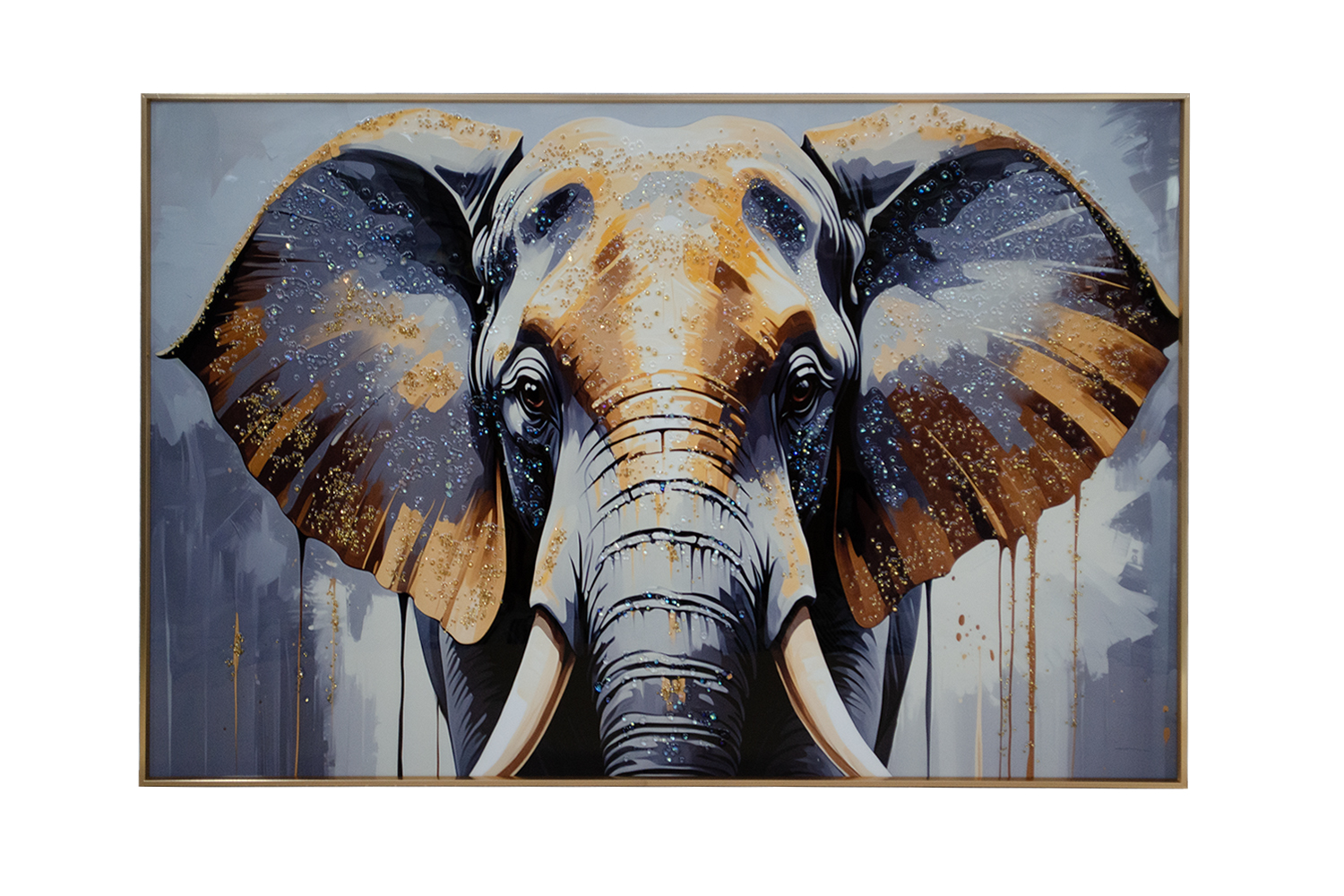 This elephant artwork features a rich blend of warm gold accents and soft grey tones set against a dark background. The striking contrast creates depth and visual impact while maintaining a balanced, modern aesthetic. Finished with a gold-tone frame, it adds a refined statement to contemporary interiors.
