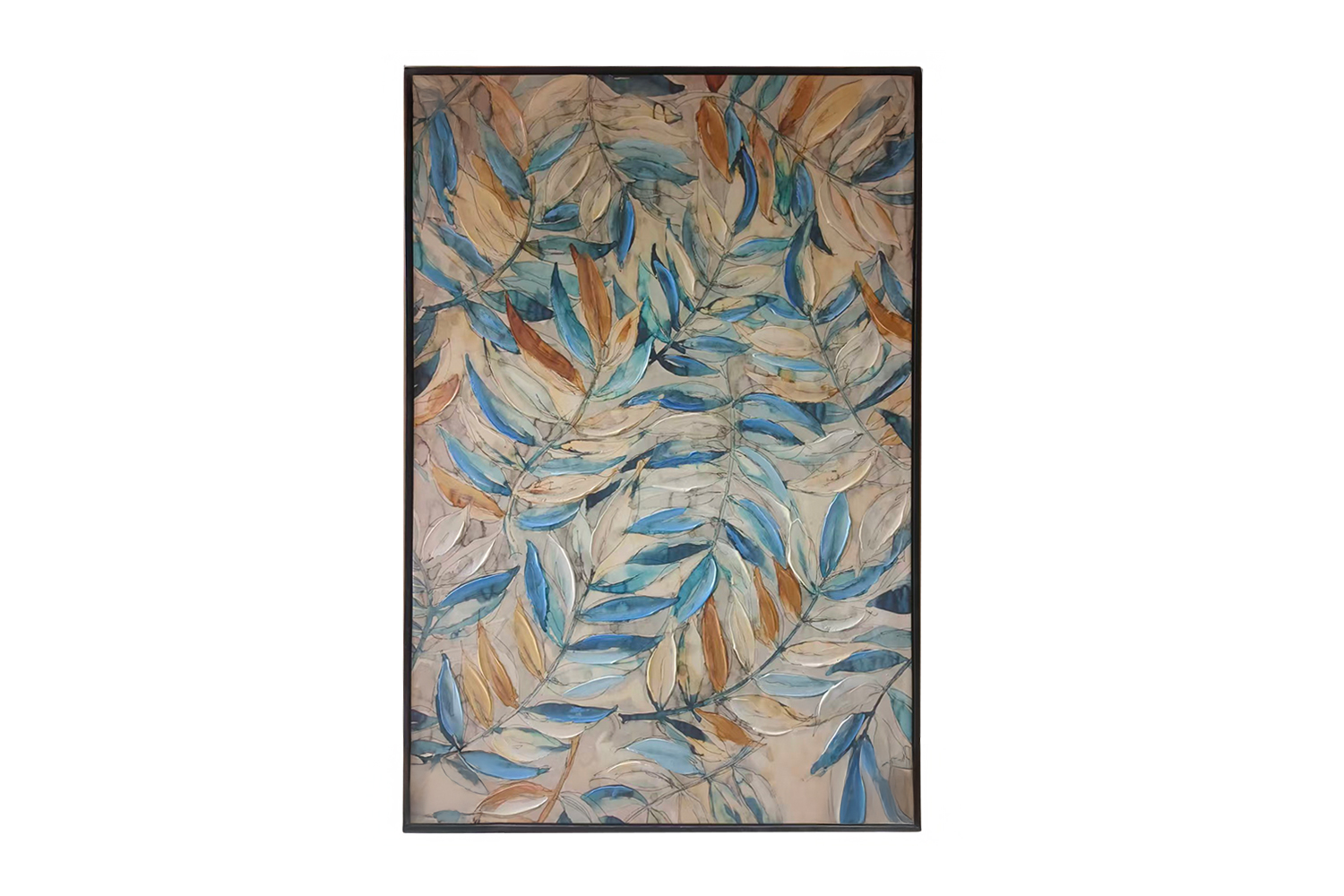 This contemporary botanical canvas art blends layered blue and earthy tones for a vibrant yet balanced look. Hand-painted detailing adds texture and depth, while the lightweight PS foam frame and 80 × 120 cm format make it a striking statement piece for modern interiors.