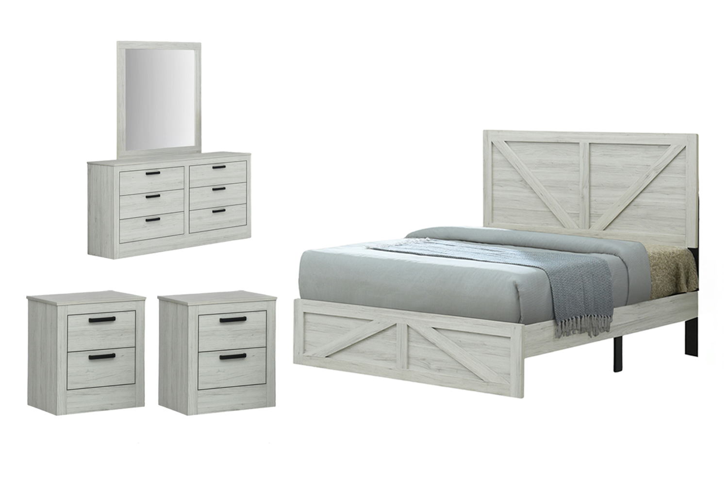 This elegant farmhouse bedroom set blends rustic warmth with modern simplicity. Featuring a weathered white finish, sturdy wood construction, and sleek black handles, it offers ample storage and flexible 4PC, 5PC, or 6PC options — creating a cohesive, stylish, and functional bedroom space.