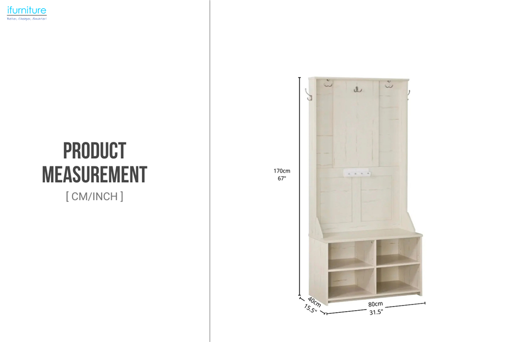 • Convenient Storage: Equipped with hooks for coats and hats, along with four spacious cubbies for shoes or other accessories, offering practical storage options.