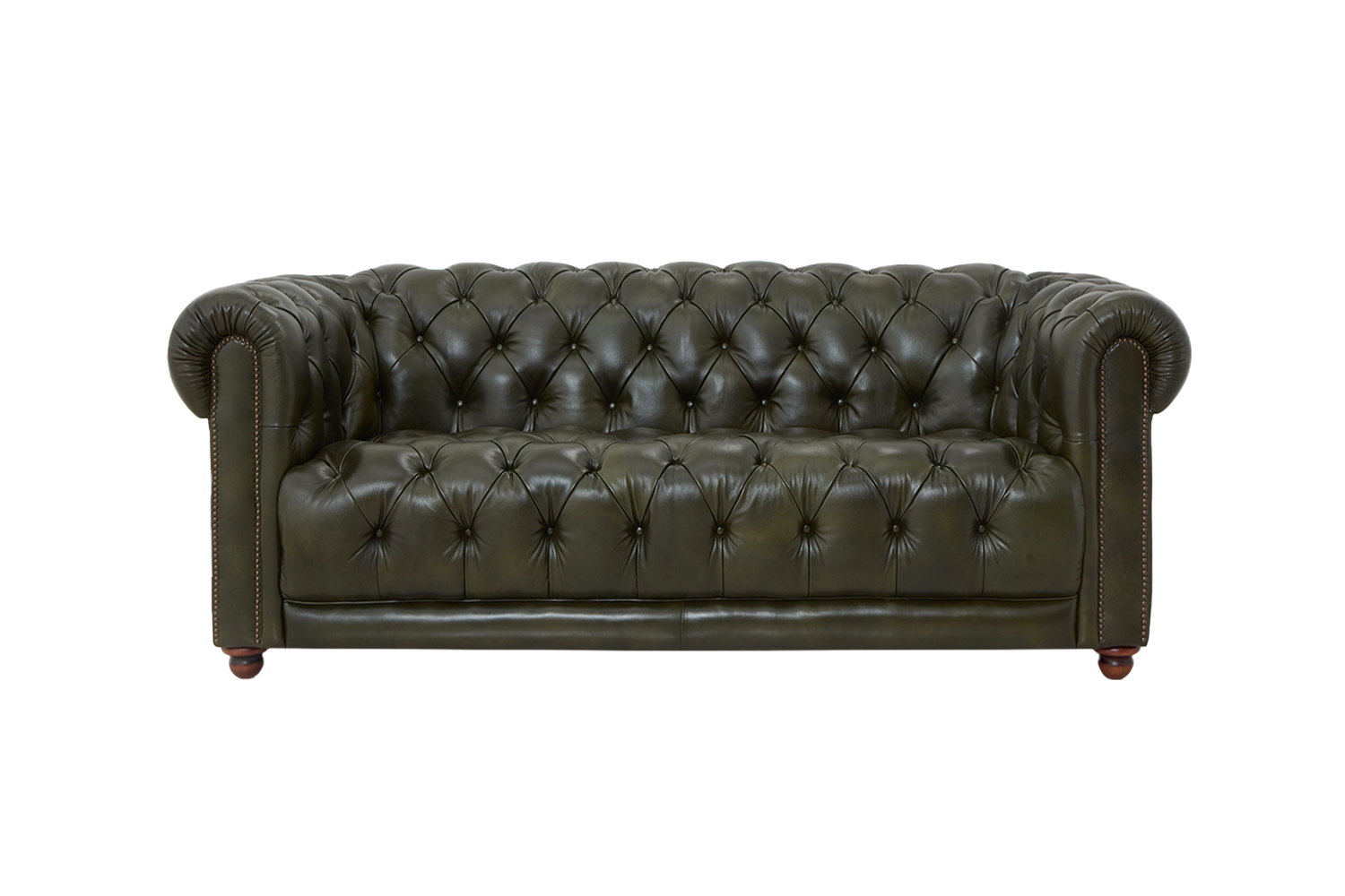 This Chesterfield sofa range is upholstered in full top grain leather, highlighting natural texture and durability. Deep button tufting, rolled arms, and a low back embody timeless elegance, supported by a sturdy pine frame with antique walnut-finished legs. Plush cushions with pocket springs, foam, and a spray-bonded cotton layer ensure comfort, while hand-applied nailhead trim adds refined detail. A versatile statement piece for any living space.