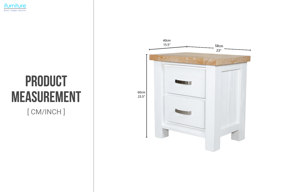 This bedside table offers two drawers for convenient bedside storage, finished with sleek metal handles. The white and natural wood design creates a clean, minimalist look that suits a variety of bedroom styles.
