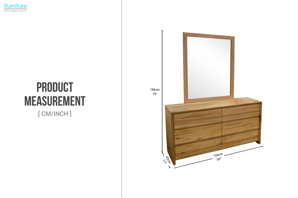 This dresser and mirror set features warm chestnut wood veneer with natural grain detailing and a clean handle-free design. Six spacious drawers provide practical storage, while the matching framed mirror completes the look with a modern rustic touch.