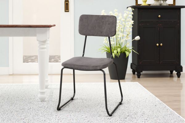The Charlie dining chairs are clothed in a comfy grey fabric. The fine-looking legs are of black steel.