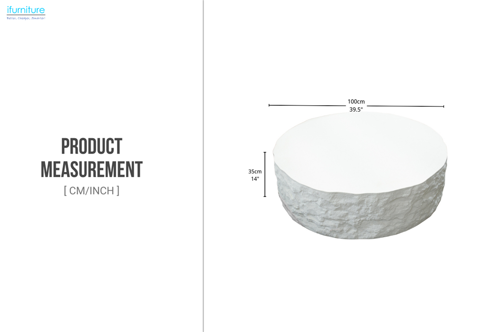 Made from FRP (Fiberglass Reinforced Plastic), this coffee table pairs durability with a lightweight build for everyday convenience. The textured stone-like sides add depth and character, while the smooth round top offers a clean, practical surface for décor or daily use. Its modern, sculptural form makes it an eye-catching accent piece that elevates any contemporary living space.