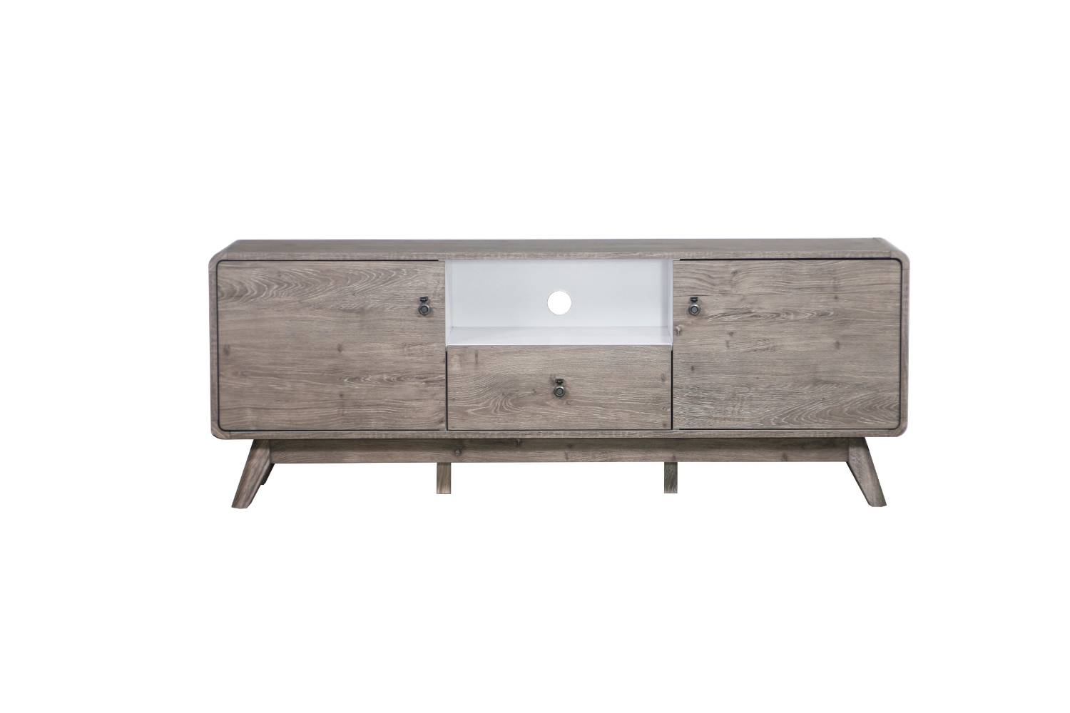 This mid-century modern TV stand blends retro-inspired design with practical storage for everyday living. Featuring rounded edges, sleek metal hardware, splayed legs, and a combination of two compartments and a central drawer, it offers a stylish and organised solution for your media setup.