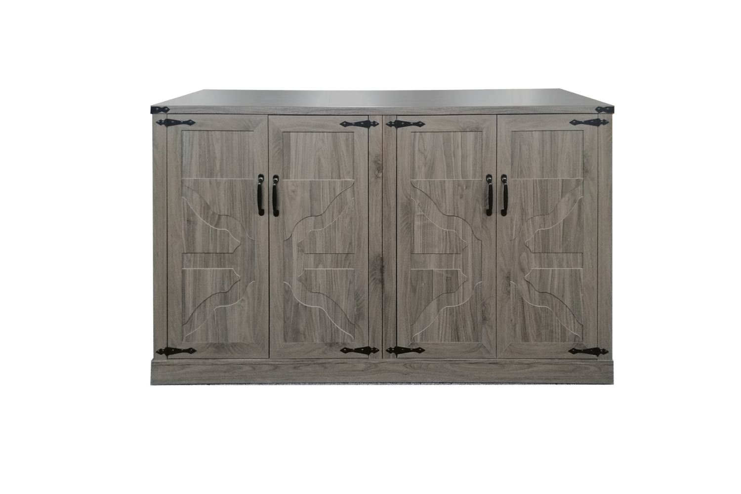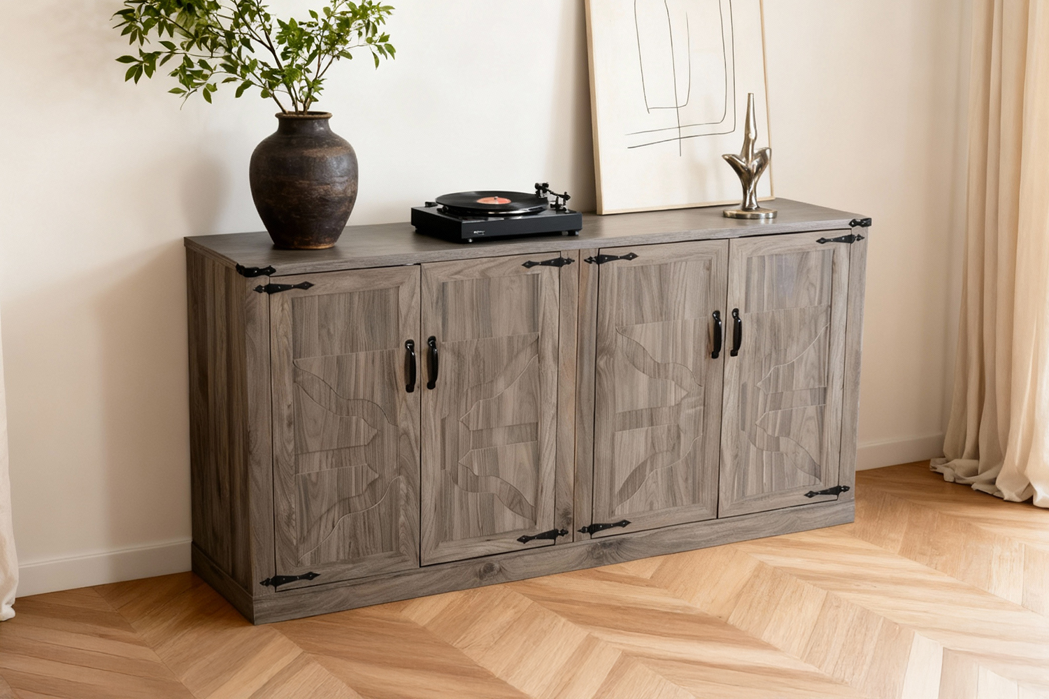 The Dorn 4-Door Cabinet blends rustic elegance with everyday functionality. Crafted from durable engineered wood, it features a warm wood-grain finish, carved door panels, and vintage metal hardware. Four spacious compartments with adjustable shelves offer versatile storage for tableware, books, or home essentials, making it an ideal addition to dining rooms, living spaces, or hallways.