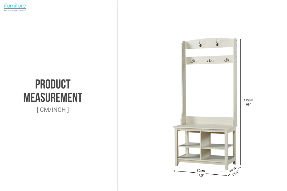 • Convenient Storage: Equipped with hooks for coats and hats, along with shelves for shoes and other accessories, offering practical storage options.