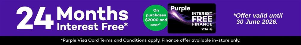 *24 months interest free is available on purchases $2000 and over using Purple Visa Card. Purple Visa Card Terms and Conditions, credit criteria and Rates and Fees (including a $55 establishment fee and a $55 annual fee) apply. Prevailing Purchase interest rate of 26.65% p.a. will apply to any outstanding balance at the expiry of the interest free period and a Cash Advance rate of 29.40% p.a. also applies (Rates and Fees current as of 1 April 2024 and subject to change). Purple Dollars Terms and Conditions apply and can be redeemed at Participating Retailers only. Purple Dollars cannot be earned or redeemed on long-term interest free purchases. Finance offer available in-store only.