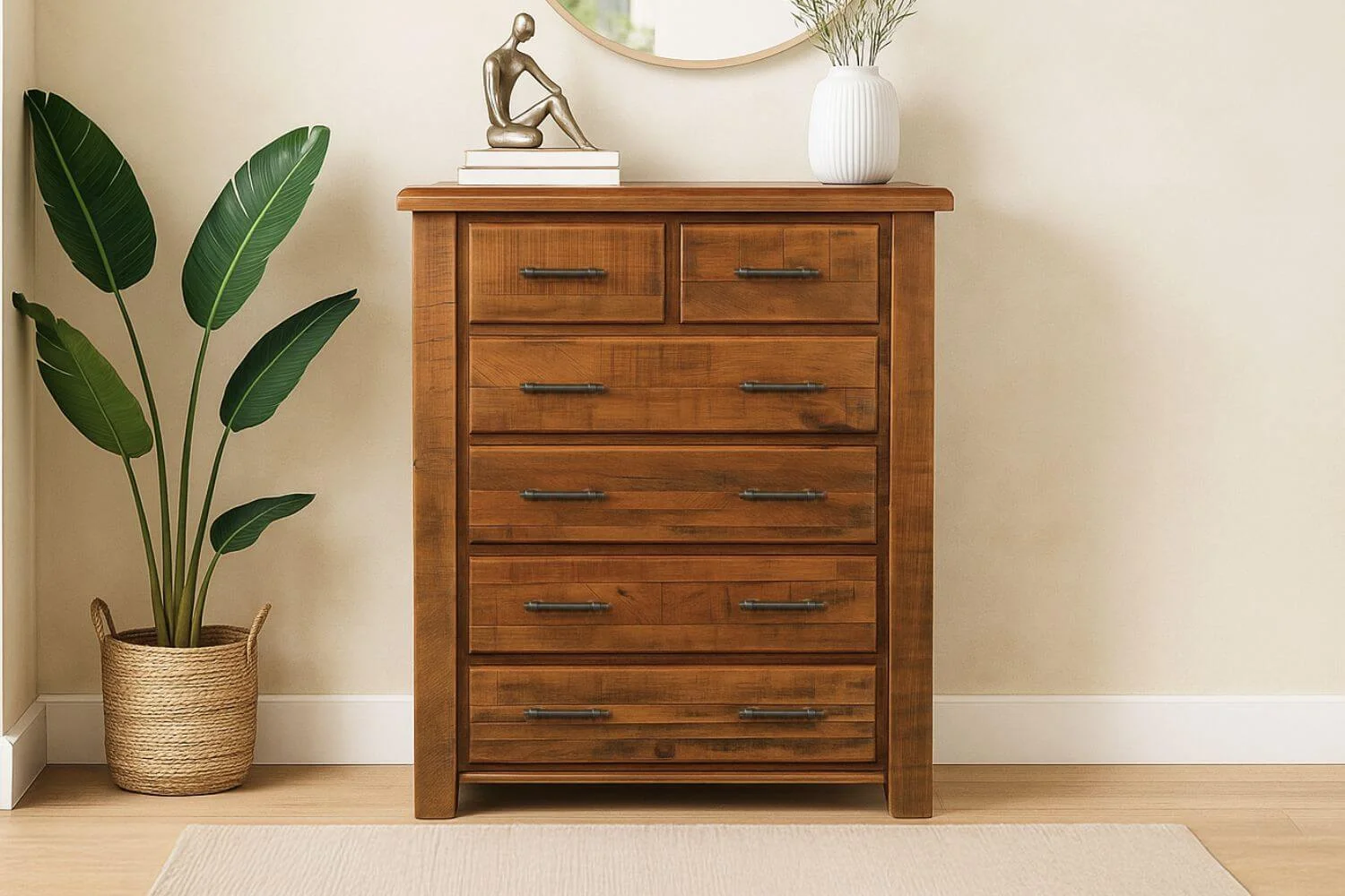 Introducing the Flinders 6-Drawer Tallboy, a captivating embodiment of rustic design and practicality. Crafted from solid pine wood, this tallboy exudes a charming, weathered character that adds depth to any room. With six spacious drawers, it offers both ample storage and a touch of rustic elegance. Elevate your living space with the Flinders Tallboy, where the natural beauty of solid pine wood seamlessly blends with functional design.