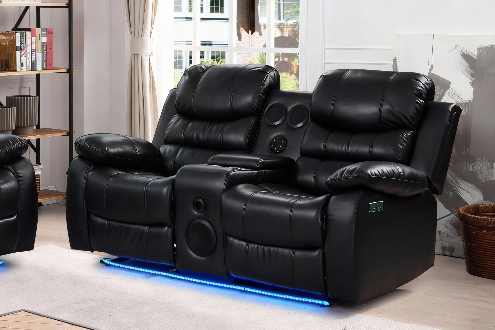 - The 2-seater reclining sofa has storage console with cupholders for practical convenience.