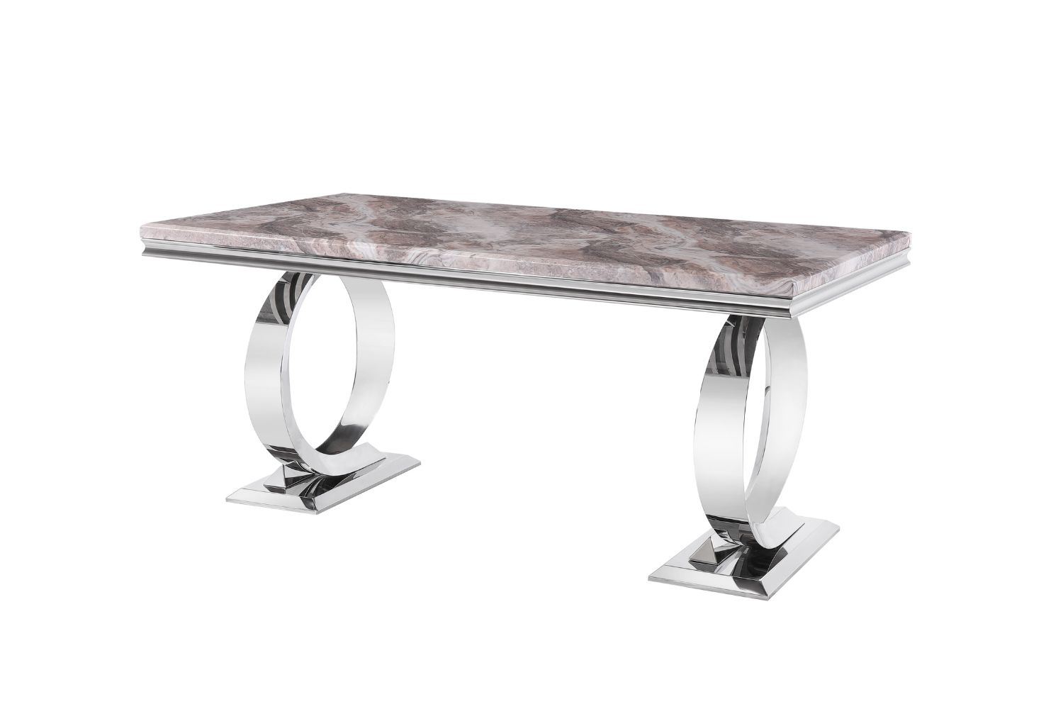 Beautiful OMEGA marble top dining table. OMEGA will surely enhance the look of your dining area. The combination of white, brown, and grey colour marble pattern with its unique ring silver legs is simply gorgeous. Eat peacefully with your family on OMEGA. The marble top is 3.5cm thick and supported by two sturdy silver steel legs. Pair OMEGA table with dining chairs with a similar colour to get a cohesive look.