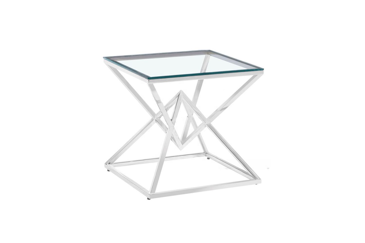 The PYRAMID series of glass-topped console tables and side tables have striking, silver-colored metal legs and frames. Bring a beautiful touch of contemporary charm to your home courtesy of this table. This lovely table is topped with a thick glass top and with a lower-level shelf which allows for ample display space. The side table is a timeless and modern addition to enhance any living space. Each piece is proudly designed and created by the manufacturer, the industry leader in contemporary home furnishings.