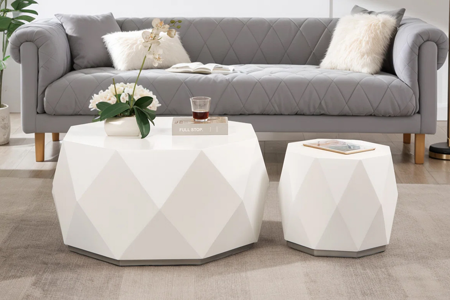 This modern coffee table set features a geometric design with clean, polygonal lines, adding a modern touch to any space. Made from durable engineered wood with a sleek painted finish, the tables are long-lasting and resistant to wear. Versatile and functional, they can be used together or separately as a coffee table and side table. The flat base ensures stable placement on any surface.