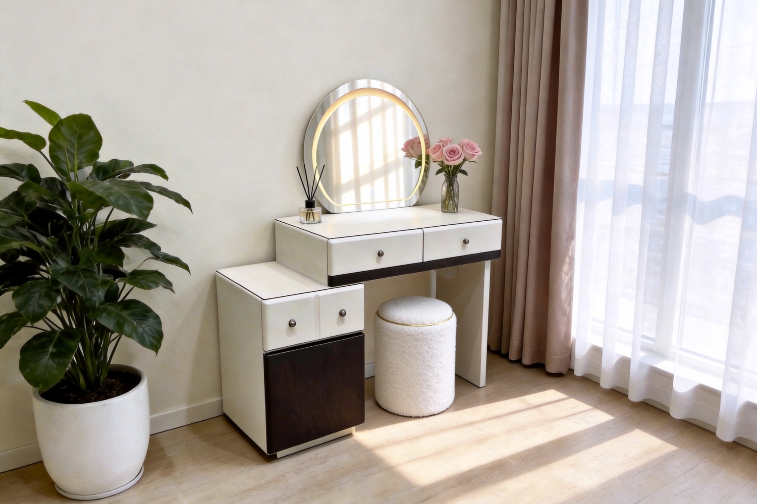 The dressing table with stool set combines smart functionality with modern style. Featuring a touch-control LED mirror with three lighting modes, a durable tempered glass tabletop, and an expandable, reversible design, it also offers practical storage with three drawers and a door cabinet. Paired with the soft teddy fabric stool accented by elegant golden trim, this set delivers comfort, versatility, and a refined contemporary look for any bedroom or dressing space.