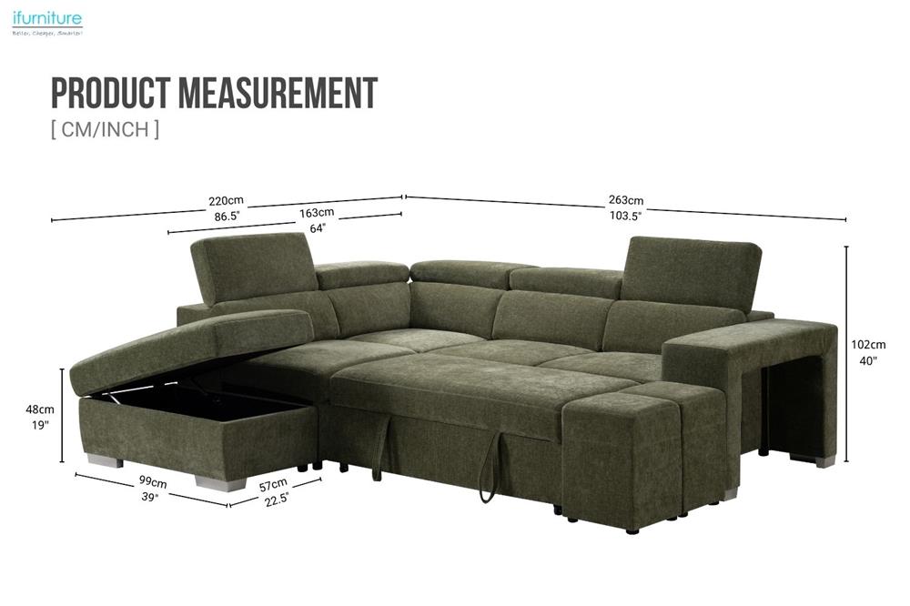 This multifunctional sectional sofa is upholstered in durable textured polyester fabric, offering a soft feel and easy maintenance. Featuring adjustable headrests, hidden stools within the armrest, a spacious storage ottoman, and a convertible sofa bed design, it delivers flexible comfort and smart space-saving functionality in a modern, minimalist style