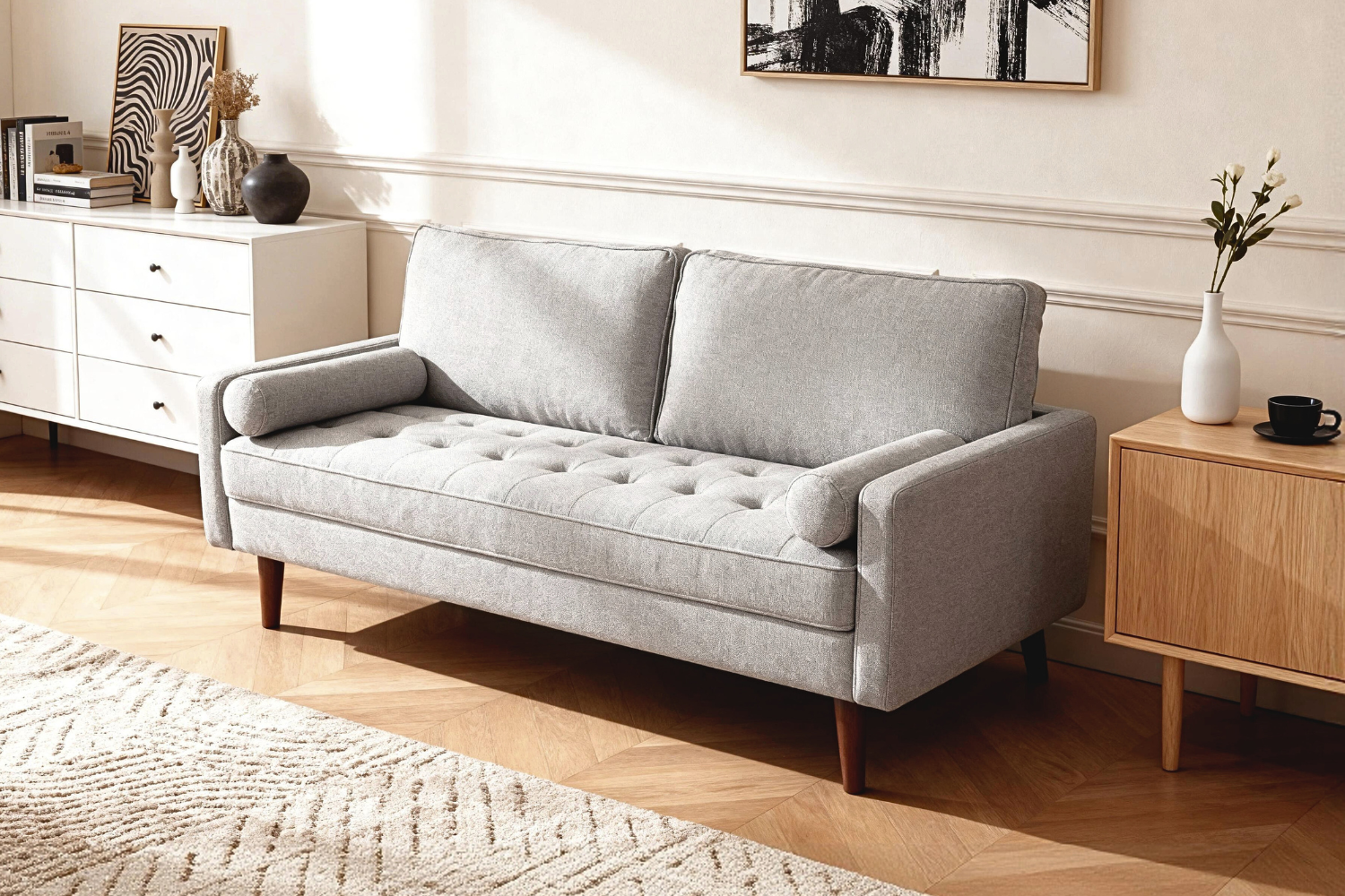 Elevate your living room with the HAROLD Seater Sofa – a modern classic designed for comfort and durability. Crafted with a sturdy eucalyptus wood frame and upholstered in medium-pile polyester linen fabric, this sofa offers a soft and inviting touch that’s perfect for everyday lounging. The clean-lined silhouette and hand-tufted seat cushions bring timeless mid-century style into your home, while metal legs with a heat-transfer wood grain finish provide a stable base and a warm natural look. Whether you’re entertaining guests or stretching out for a cosy night in, HAROLD combines comfort, quality, and contemporary charm in one stylish package.