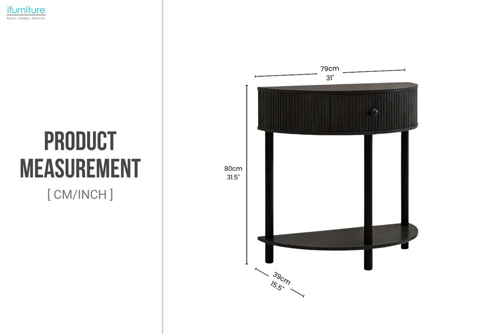 With its half-moon shape and fluted front, this console table adds depth and visual interest to any room. Designed with a drawer and lower shelf for everyday storage, it features an all-black finish for a sleek, cohesive, and modern look.