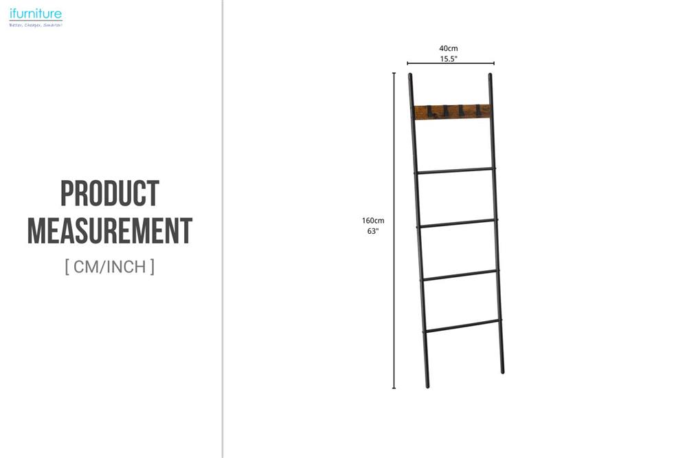 This 5-tier ladder shelf combines a space-saving vertical design with a modern industrial style, featuring a black metal frame and rustic wood accents. Offering ample storage with multiple tiers and removable hooks, it keeps towels, clothes, and décor neatly organised. Built with durable materials and equipped with anti-tip fittings and protective pads, it ensures stability, safety, and long-lasting use.