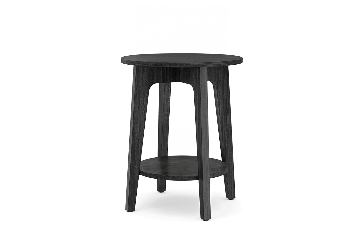 This mid-century inspired side table features a dark wood-look finish with a round top and tapered legs, bringing a warm and timeless touch to your space. The two-tier open design offers practical storage, with a smooth tabletop for everyday essentials and a lower shelf for books or décor. Compact and versatile, it fits neatly beside sofas or beds, making it a functional addition as a side table, bedside table, or plant stand.