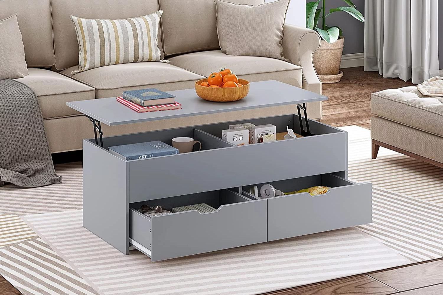 Lift-up top coffee table, 2 large drawer under, hidden compartment, grey colour