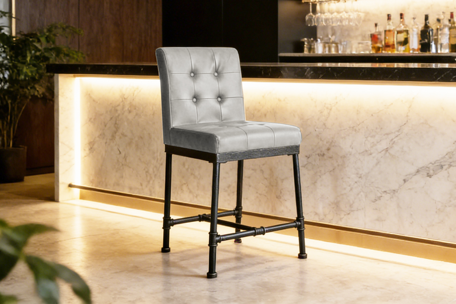 The LENTO Bar Chair combines modern industrial style with ultimate comfort. Upholstered in premium vegan leather, the seat is foam-padded for a plush feel. The sturdy metal legs provide both strength and a contemporary aesthetic, perfect for bar areas, kitchen islands, or home dining spaces. The sleek design, complemented by tufted detailing on the seat and backrest for any modern home.