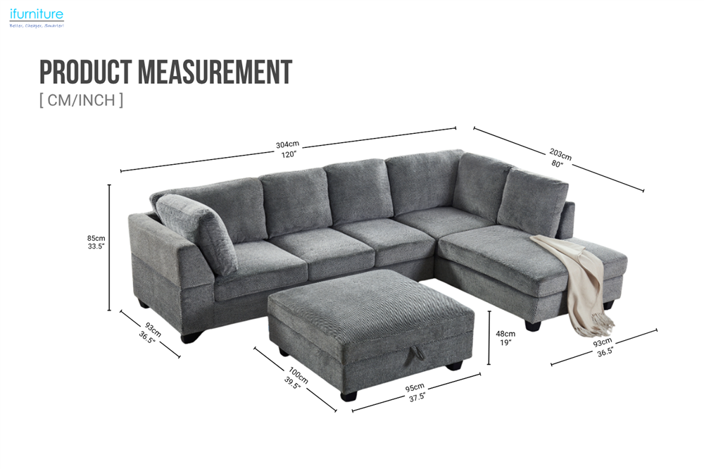 LIBERTY Premium Sectional Sofa (Grey) - Chaise Facing Right with Storage Ottoman