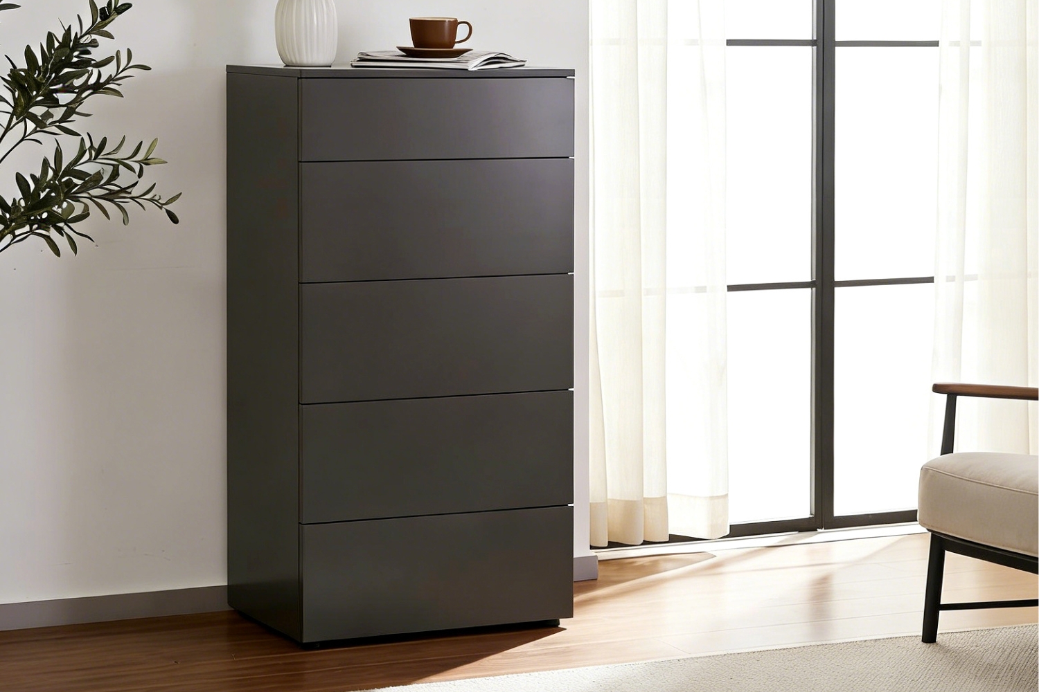 • Sleek and Modern Design: This 5-drawer tallboy blends minimalist design with a matte grey finish, offering both style and functionality—an ideal addition to any home.