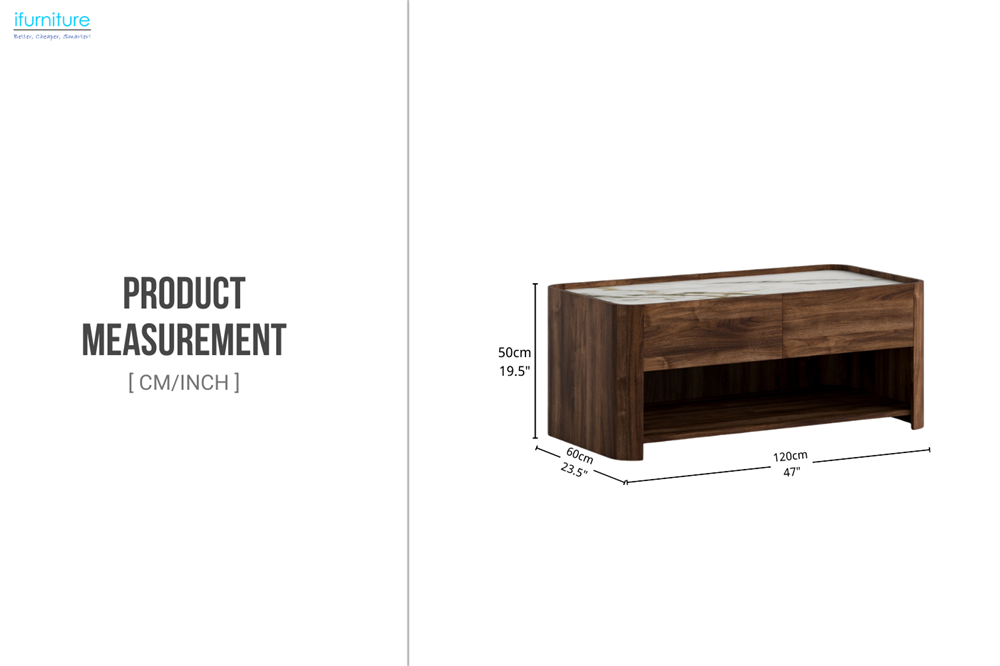The MERRINA 120 2-Drawer Coffee Table combines a marble-look sintered stone top with a rich walnut-toned engineered wood body. Designed with smooth, rounded corners, raised tabletop edges, and two deep drawers, it keeps your living space organised while delivering a clean, modern statement.