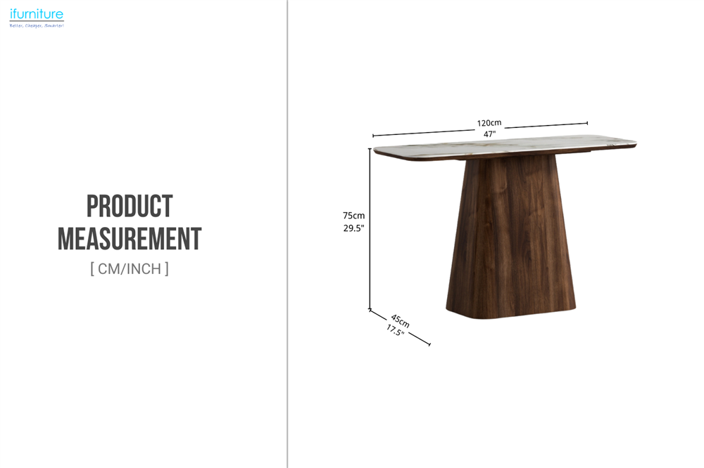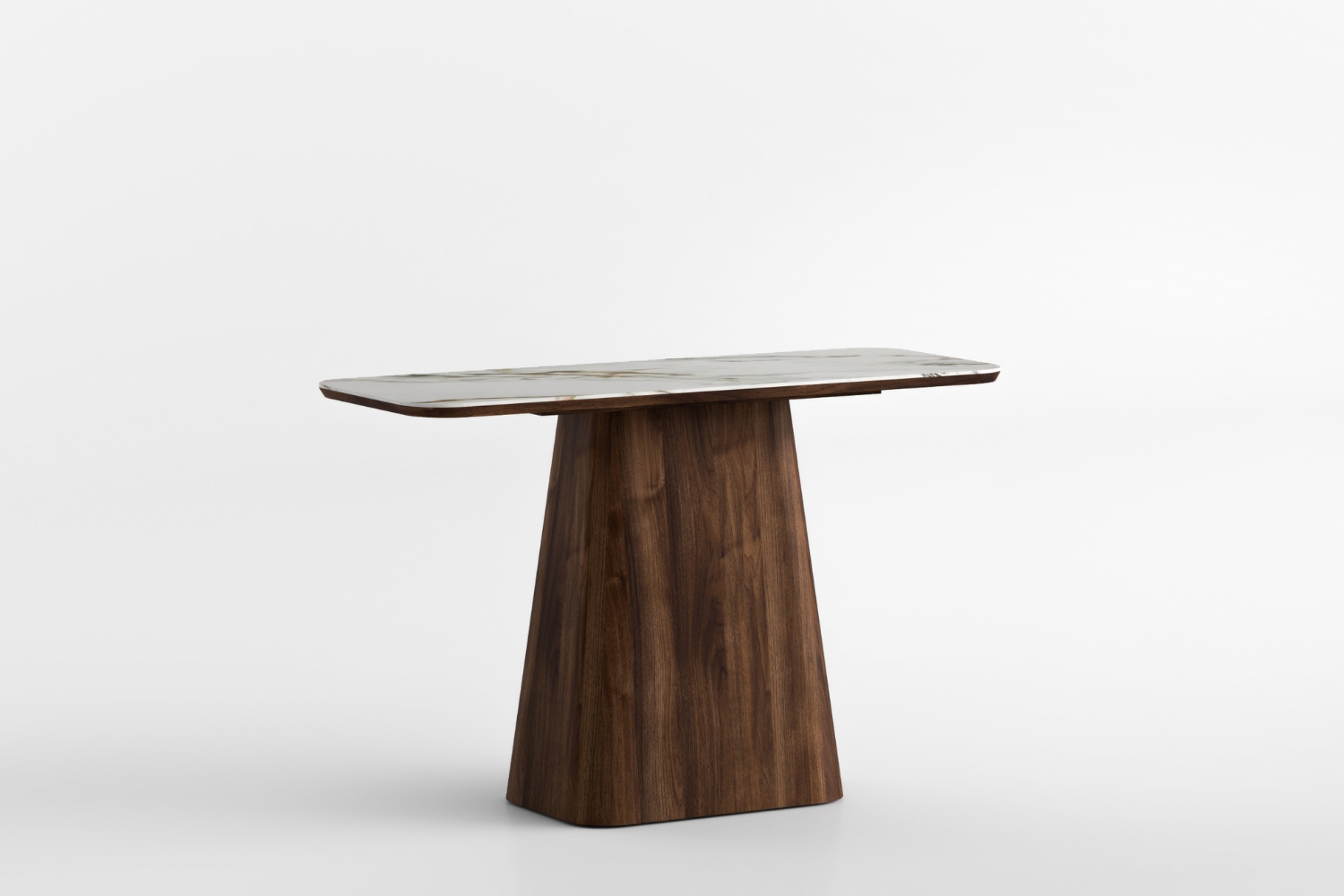 The MERRINA 120 Console Table pairs a marble-look sintered stone top with a warm walnut-toned engineered wood pedestal base. With soft, rounded corners and a clean, sculptural silhouette, it’s a sleek statement piece for entryways, hallways, or behind a sofa.