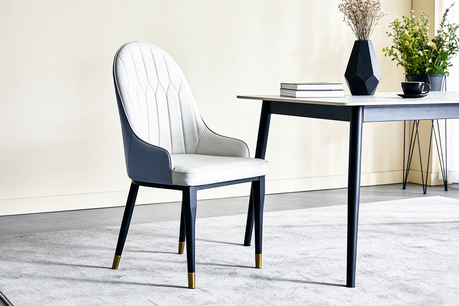 Ideal Vegan Leather: Upholstered in smooth vegan leather that delivers a refined appearance, is easy to maintain, and ideal for everyday dining settings.
