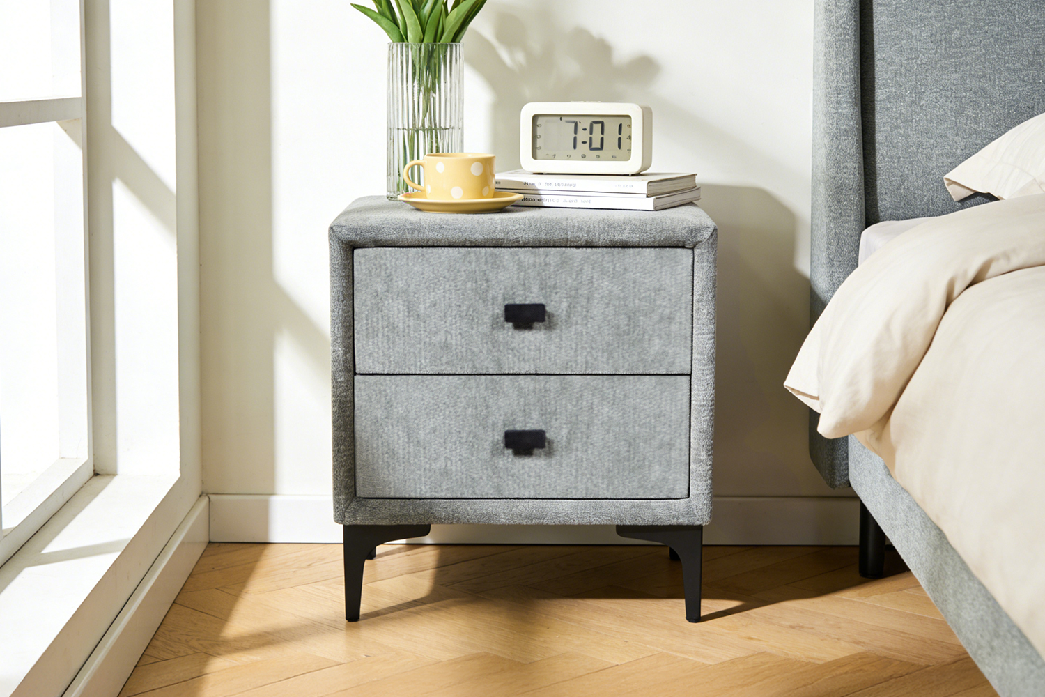 Upholstered in soft fabric with a foam-padded structure, the MOTIONFLEXI 2-Drawer Bedside Table offers a clean, modern look with a subtle, comfortable touch. Its compact design and practical storage make it an easy fit for contemporary bedroom spaces.