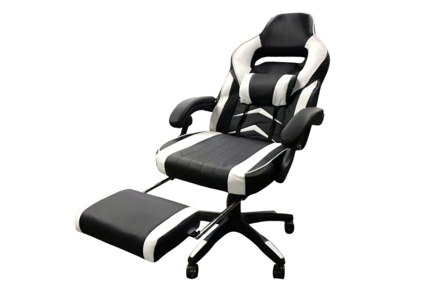 This Gaming Recliner Chair features height adjustment, 360-degree swivel, and a recline function for ultimate comfort. The vegan leather upholstery is durable and easy to clean. Nylon linkage armrests move with the chair, ensuring consistent support, while the ergonomic lumbar pillow promotes good posture. The extendable footrest offers added relaxation, and nylon casters provide smooth, quiet movement. The Class 3 gas lift ensures stability and durability.