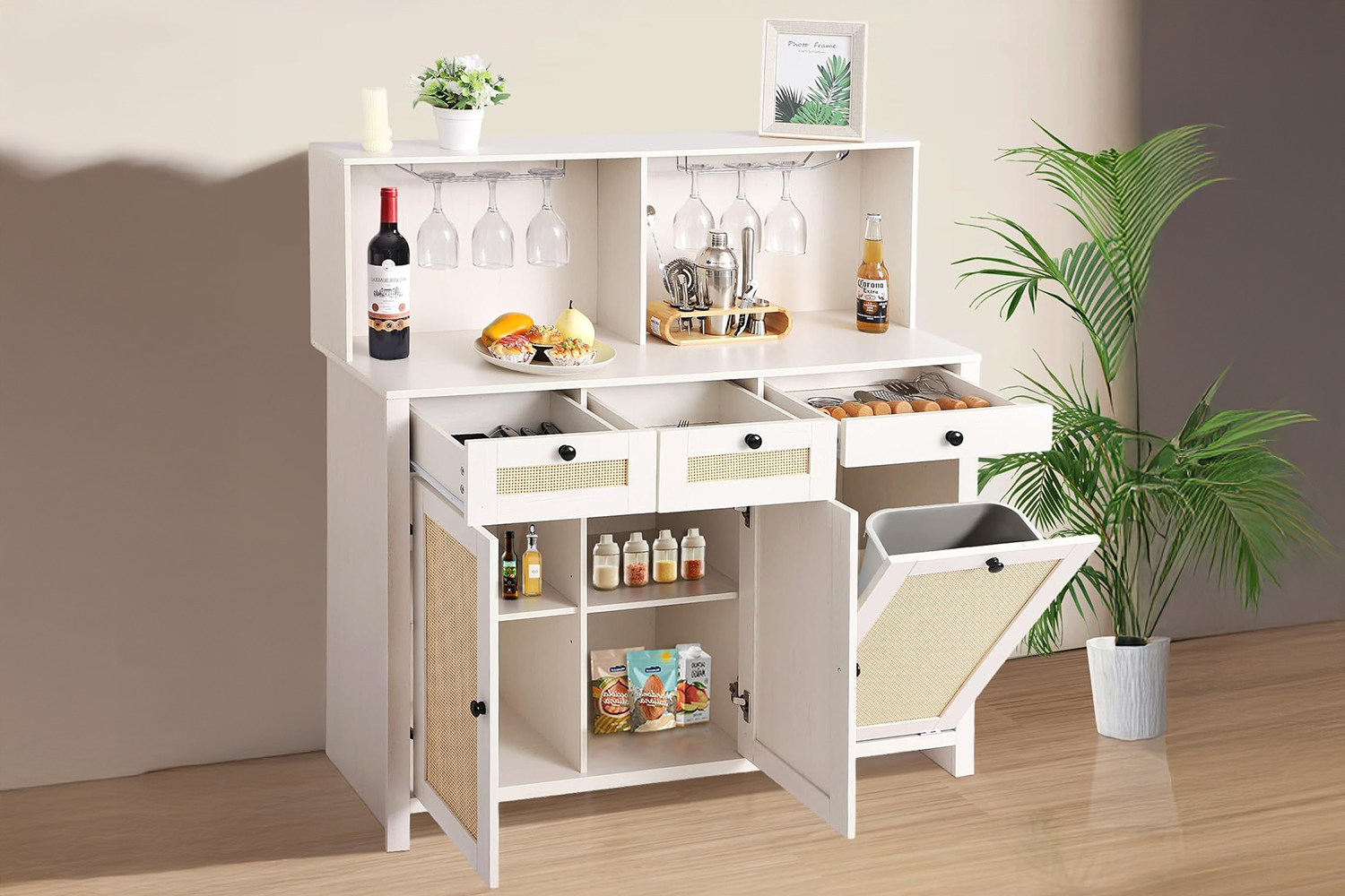 This versatile cabinet offers ample storage with a spacious top, three drawers, adjustable shelving, and stemware racks for organised living. Featuring remote-controlled LED lighting, a convenient tilt-out trash bin, and woven plastic rattan accents, it adds both functionality and a stylish touch to any space.