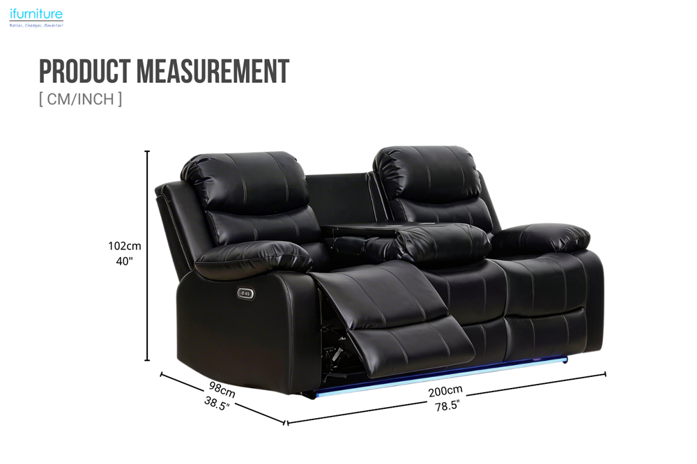 This 3-seater sofa features durable air leather upholstery and a solid poplar wood frame for lasting comfort and support. The smooth electric reclining mechanism adjusts the backrest up to 150°. It also includes a drop-down console with cup holders and a table surface. Integrated USB charging and blue LED base lighting provide added convenience and create a home theatre-style atmosphere.