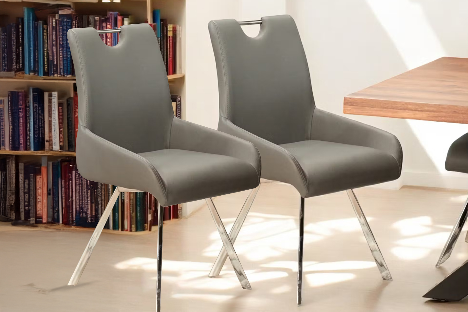 Experience modern dining comfort with the REIME Chair. Upholstered in light grey PU leather and supported by a sleek metal base, this chair features a smooth 180° swivel with auto-return function, perfect for both style and convenience.