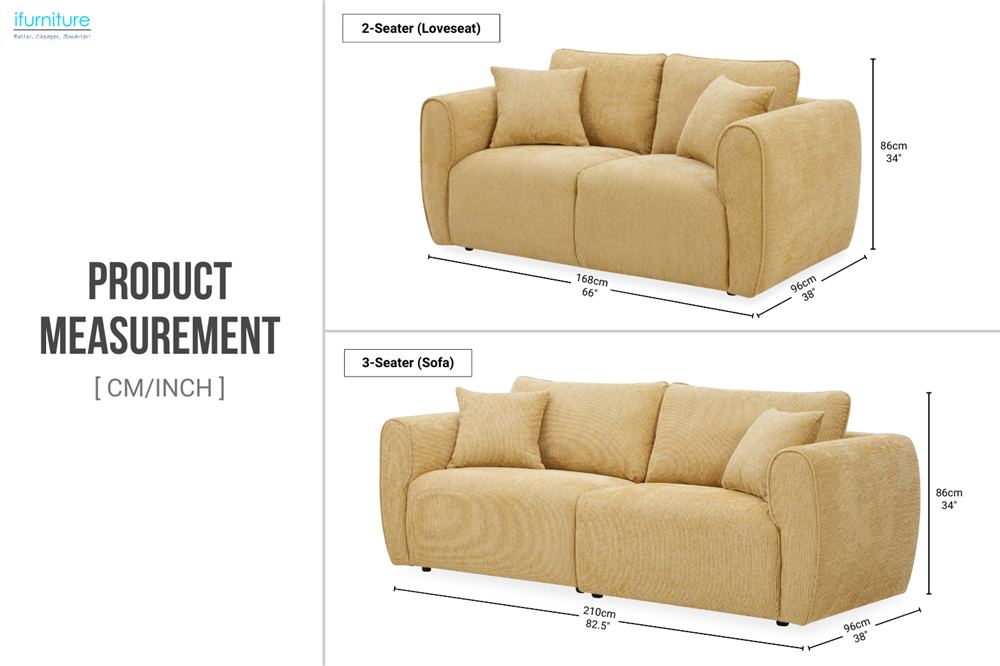 This sofa set features soft, durable upholstery and high-density foam for comfort and support. Each piece includes two matching pillows for added coziness. The warm color and rounded edges create a relaxed, inviting atmosphere. Available in 3-seater and 2-seater options, it fits various room sizes and layouts.