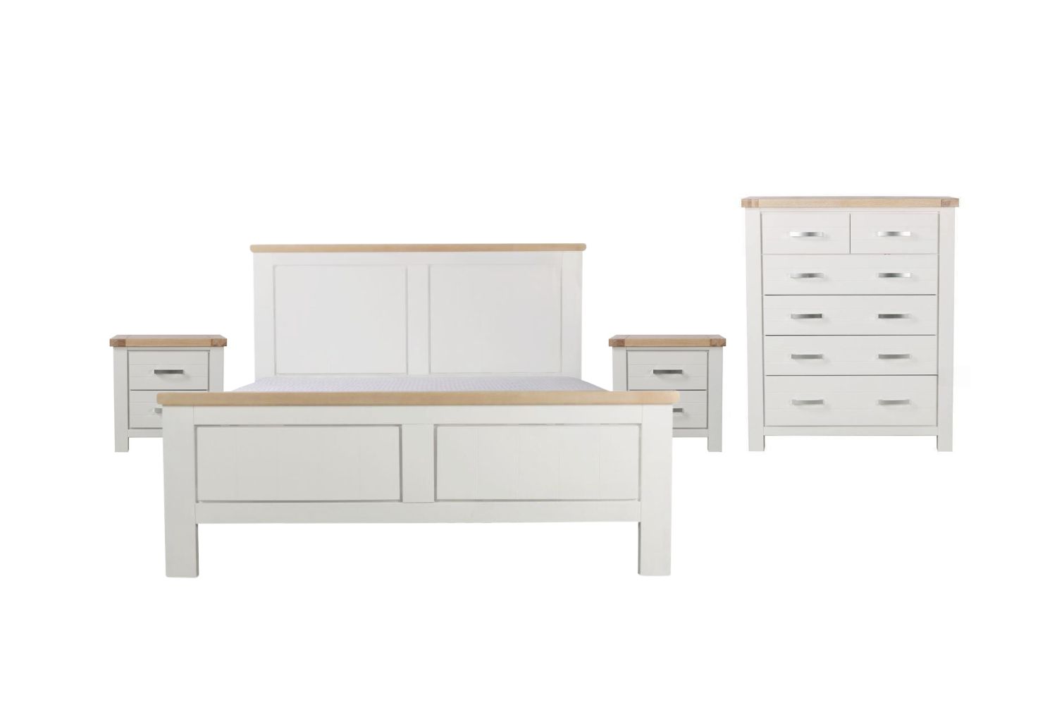 The large SICILY series is painted crisp and white with light brown ash timber tops. It brings a light and bright feel to any room.The range utilizes solid timber: pine is the white painted wood, with light ash timber for effect. All items are solidly built and use polished silvery handles on all drawers. SICILY comprises Queen bed frame, 2 drawer bedside table, 5 drawer tallboy, 6 drawer chest, 7 drawer dressing table and mirror, hall table, small desk, 1 drawer lamp table, 2 door tv unit, plus 2x bookcases -1900x1000, 1900x600, blanket box, Large and small tv unit, display cabinet and buffet.