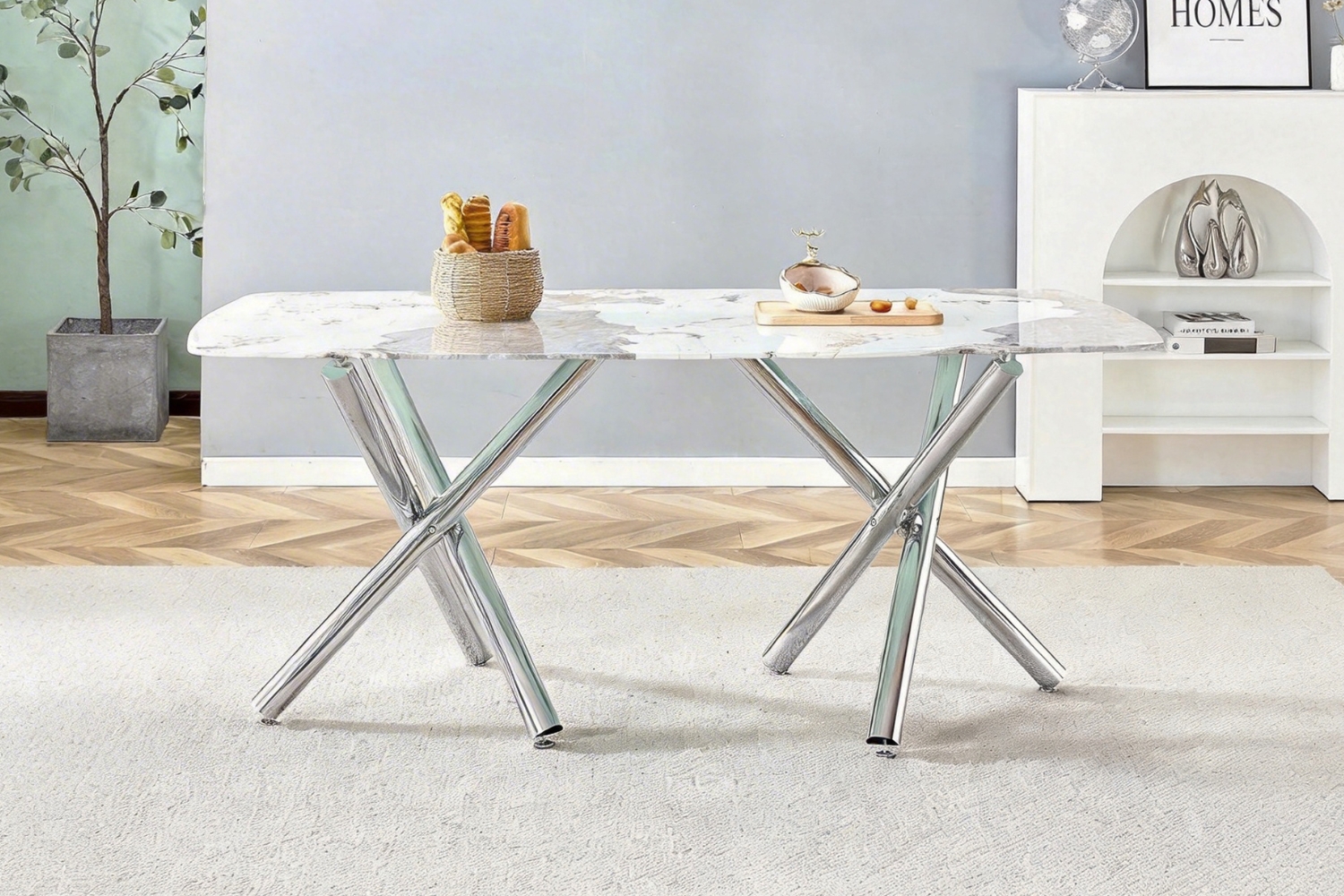 This elegant dining table features a durable, easy-to-clean marble-look tempered glass top and chromed X‑shaped crossed metal legs for style and stability. With soft, rounded edges and anti-slip foot mats, it combines modern design with functionality, making it a perfect fit for contemporary interiors.
