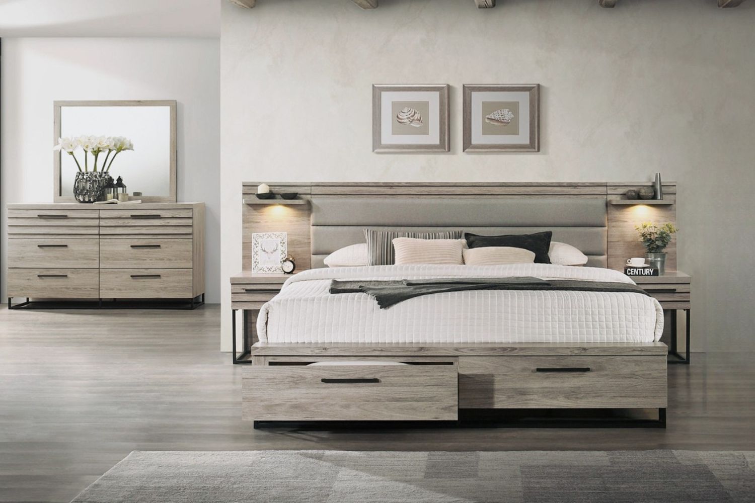 Discover the epitome of durability and elegance with our WESTDEN bed frame. available in 3-piece, 4-piece, 5-piece, and 6-piece combo options to fit your space and storage needs. Adorned in a sleek light grey finish, it brings sophistication to any bedroom setting. With integrated LED lighting bedside tables, experience contemporary flair and adjustable ambient lighting at your fingertips. Bed frame, tallboy, dresser with mirror, bedside table, and side pier combine modern farmhouse style with practical functionality for a clutter-free space.