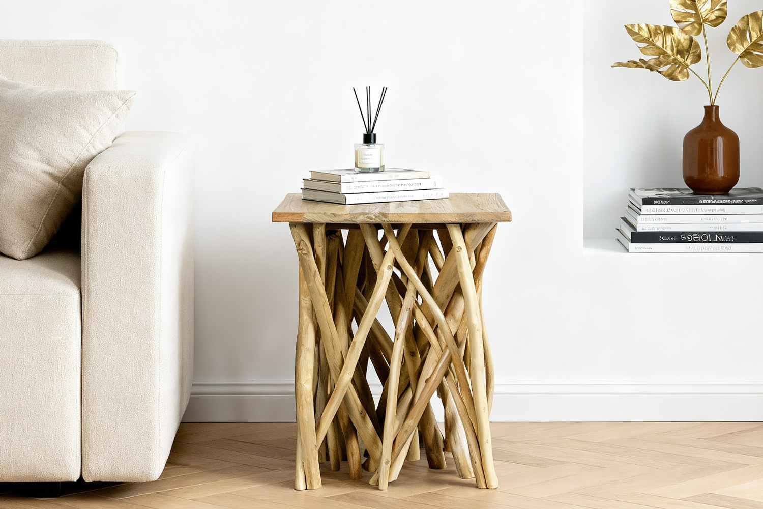 This table features a solid teakwood tabletop with organic textures and weathered grain patterns, complemented by unique branch-inspired teak driftwood legs. Its spacious square surface offers ample room for lamps, books, or décor. Ideal as a side table, it complements modern, rustic, or eclectic interiors in living rooms, bedrooms, or entryways.