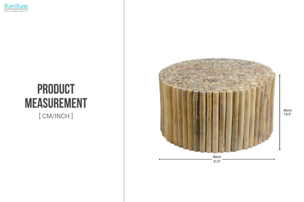 This round coffee table features a stacked teak branch base, forming a unique cylindrical frame with rich natural texture. The smooth circular tabletop provides ample space for daily use, blending practicality with natural beauty. Ideal for rustic, bohemian, eco-inspired, or modern interiors, it adds a touch of organic elegance to any space.