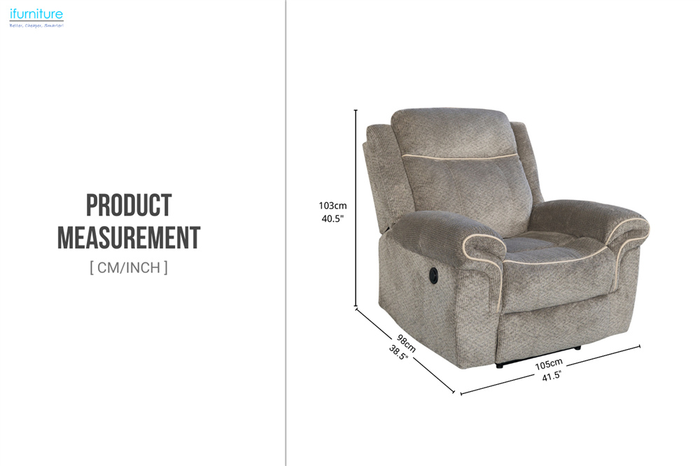 This 1-Seat Recliner Chair combines comfort and style with its soft, textured fabric upholstery and supportive foam cushioning. The smooth power reclining mechanism allows effortless relaxation, while its neutral tone complements a wide range of interior styles, making it a versatile addition to any room.