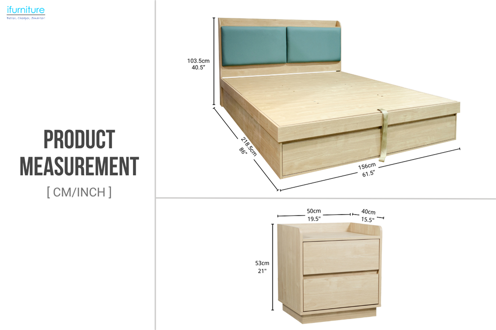 The YORU Queen Size Bed and matching bedside tables combo combines modern style with practical storage. The bed features a gas lift mechanism for easy access to under-bed storage and two foot-drawers for added organization. The bedside tables offer two drawers and a tray-style top to keep essentials secure. With a minimalist design, natural wood finishes, and a soft teal upholstered headboard, this combo brings both elegance and functionality to any bedroom.