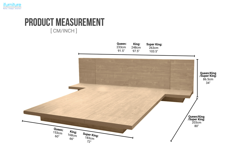 Package(s) Measurement (cm) Queen: 210x65.5x13 (P1) 209x41x11 (P2) 159x65x8 (Queen size headboard), King: 210x66x12.5 (P1), 208x56x10 (P2) 174.5x65x8( King size headboard), Super King: 210x66x13.5 (P1), 210x72x10 (P2) 189x65x8 (Super King size headboard)