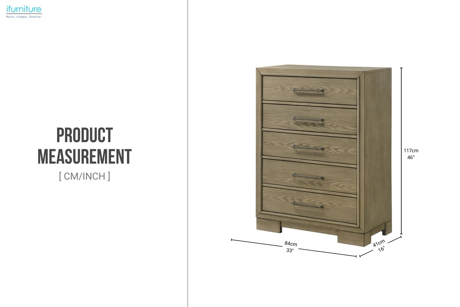 Bring effortless style and practical storage to your bedroom with the KENORA 5-Drawer Chest. With a warm weathered oak finish that reveals the wood-like grain, this tall chest strikes the perfect balance between rustic appeal and modern lines. Clean edges and metal hardware add a refined industrial touch, while the five spacious drawers offer generous room for organising clothing, linens, and essentials. Crafted with durability and timeless charm in mind, the KENORA Series is a smart solution for those seeking both form and function in their bedroom décor.