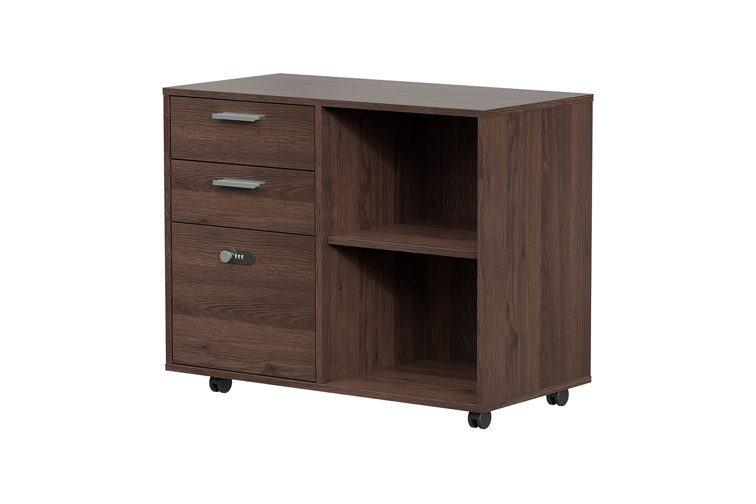 Compact and secure, this mobile file cabinet features a password-locked drawer, 2 standard drawers, and smooth-rolling wheels. Its space-saving design fits under most desks, keeping documents and supplies neatly organised and within reach.
